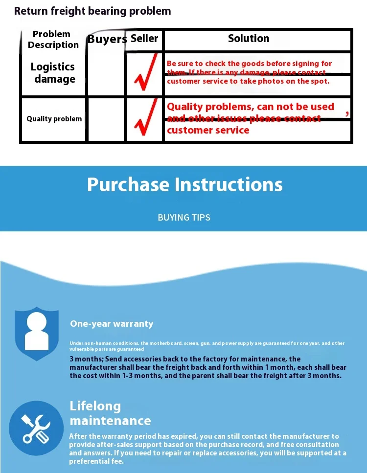 In non-human circumstances,Motherboard,Screen,Gun,Power supplyOne-year warranty,Other Wearing PartsMaintenance Warranty3Months;Send parts back to the factory for repair,