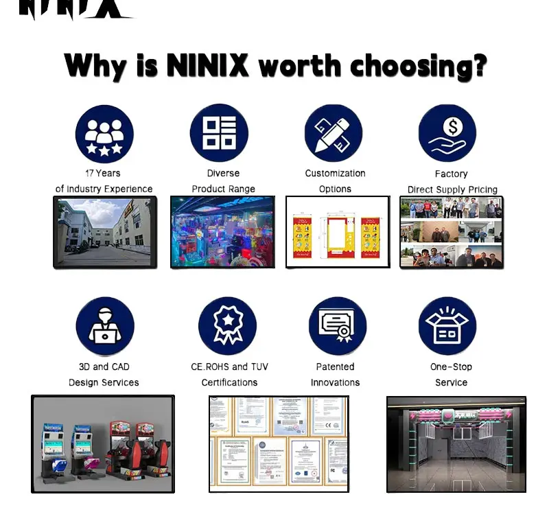NINIX is located in Panyu District, Guangzhou. It has a 20,000-square-meter exhibition hall and factory, and has over 15 years of experience in manufacturing, supplying and operating entertainment game machines. We focus on indoor entertainment equipment, including various VR simulators, racing, shooting motorcycles, exchange games and arcade children's amusement facilities, etc. We have the most professional R&D team and a strict professional quality control team. We have many exquisite styles with excellent quality. During this process, we follow and maintain strict quality standards and conduct in-depth market analysis to ensure that the provided results can meet the expectations of customers. We always believe that customer satisfaction is paramount, and we will win accordingly. The brand concept of NINIX is quality first, providing high-quality services to every customer. NINIX offers one-stop solutions to customers.