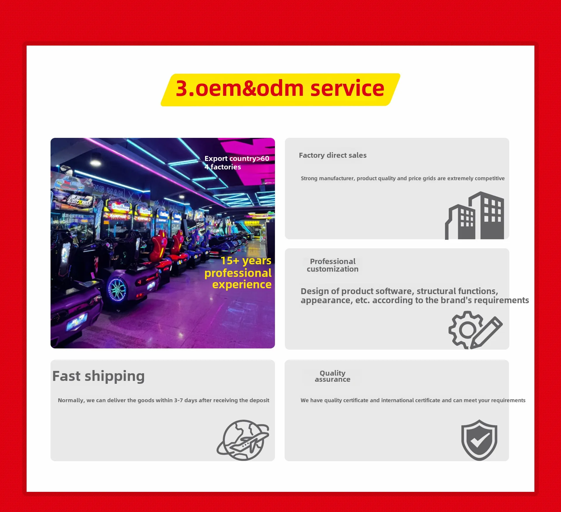 We offer one-stop services including budget planning, product design, quality control, packaging, shipping and after-sales support. Our quality products and services are sold all over the world, with a strong presence in North and South America, Europe, the Middle East and Africa.